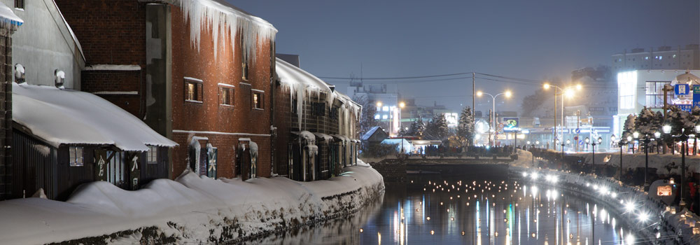 小樽市は、北海道南西部に位置する街です。北海道開拓時代から湾岸都市として栄え、現在も美しい街として広く知られます。石造りのレトロな倉庫群と、そこに横たわるように流れる小樽運河が代表的な観光スポットです。夜になると、運河沿いにある63基ものガス灯が灯って散策路がライトアップされ、幻想的な雰囲気を楽しめます。