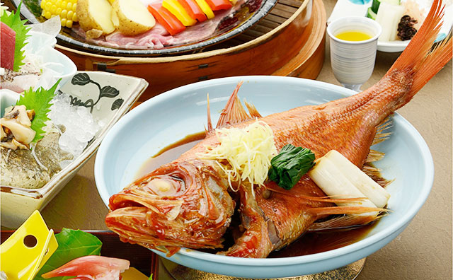 食事は一品一品、素材の美味しさを楽しめる和食コース。日本海の幸や地元特産品の村上牛、目の前で炊き込む極上のコシヒカリはここでしか味わえない美味しさです。