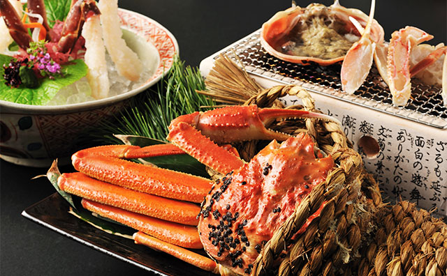 食事はミシュランガイドで評価されたずわい蟹料理や、九谷焼・山中塗の器を用いた繊細な会席料理を楽しめます。