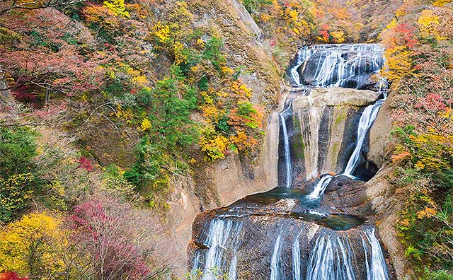 秋は周囲にせり出した木々が鮮やかに紅葉し、袋田の滝を美しく彩ります。周辺には記念撮影に適したモニュメントや落差約15mの「生瀬滝」などがあり、温泉施設も豊富です。