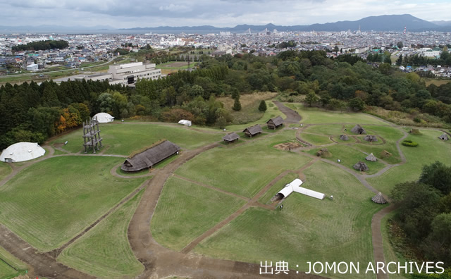 陸奥湾をのぞむ段丘上に立地する大規模な拠点集落。集落は、竪穴建物、墓、貯蔵穴、掘立柱建物、盛土など多様な施設で構成されています。膨大な土器や石器、日本最多の 2000点を超える土偶などの祭祀遺物、多種多様な動物骨や魚骨、クリやクルミなどの堅果類などから、内湾地域における生業と祭祀・儀礼の多様性を示す重要な遺跡です。