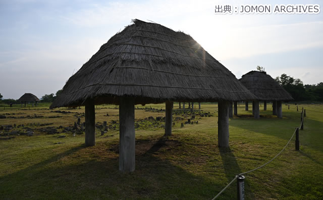 大湯川沿いの段丘上に立地する環状列石を主体とする祭祀遺跡。万座と野中堂の2つの環状列石は川原石を組み合わせた配石遺構によって二重の円環が形成され、それぞれに「日時計状組石」が配置されています。環状列石の周囲には掘立柱建物が同心円状に配置され、土偶や鐸形土製品、石刀等などの祭祀遺物が数多く出土しています。