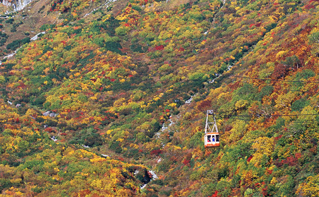 立山の紅葉の特徴は赤や黄色だけでなく、ハイマツの濃緑・チシマザサの淡緑など豊富な色彩であること。立山ロープウェイは標高差500m、全長1,710mをわずか7分で昇降し、動く展望台とも呼ばれています。