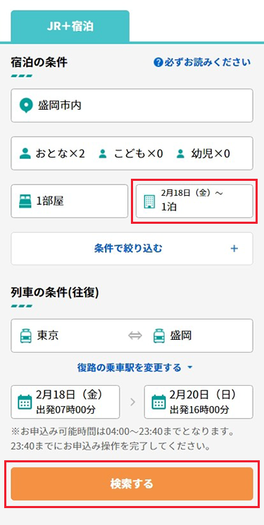 利用列車選択後、1泊目の宿泊施設とプランを選択します。